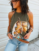 Say howdy to your new go-to summer tank. Featuring a hand-painted-style portrait of a trusty ranch horse, the Ol’ Paint Halter Tank brings laid-back western vibes with a flattering fit. Set on a soft, olive green cotton, this halter cut gives you all-day comfort and cowboy-approved charm.