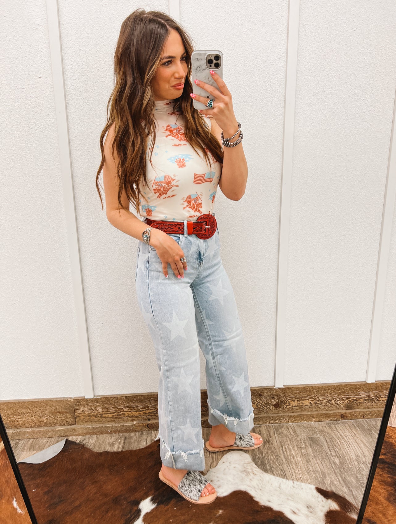 Saddle up and show off your wild side with our American Cowboy Tank Mesh Top. Made with breathable mesh fabric, this top is perfect for keeping cool while tending to the ranch or hitting the town. The bold cowboy design adds a touch of western charm to any outfit.