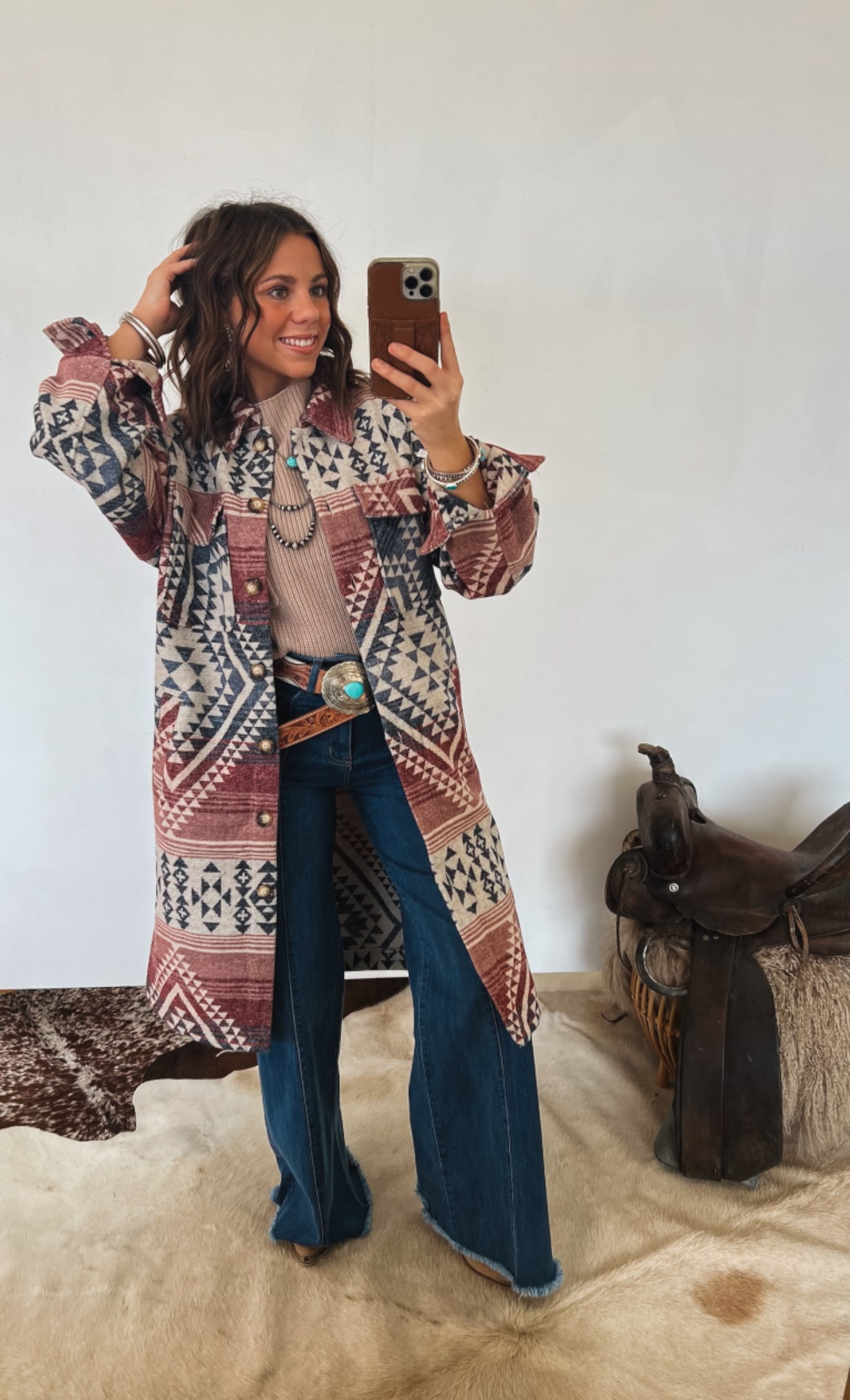 Make a bold statement with the Aztec Queen Jacket Coat, where western flair meets cozy comfort. This longline coat features a striking Aztec-inspired print in rich neutral tones, perfect for layering through the cooler seasons. Designed with a button-front closure, chest pockets, and a relaxed silhouette, it brings both warmth and effortless style to any outfit.
