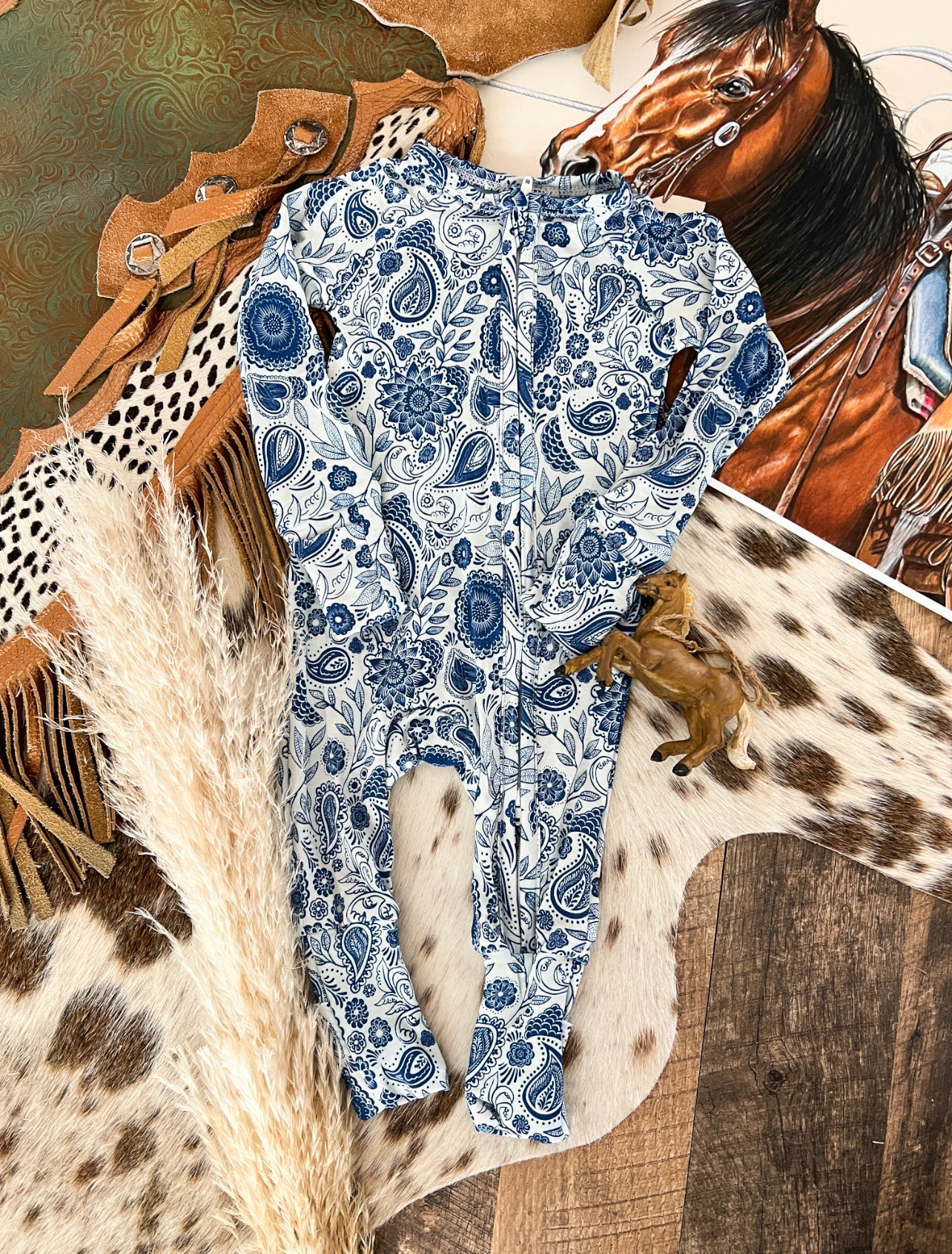 Unleash your wild side with our Western Double Zipper Pajamas. Featuring a unique double zipper design, these pajamas provide ultimate comfort and convenience for those late night wrangling sessions. Made from high-quality materials, they are sure to last through all your little cow kid adventures.
