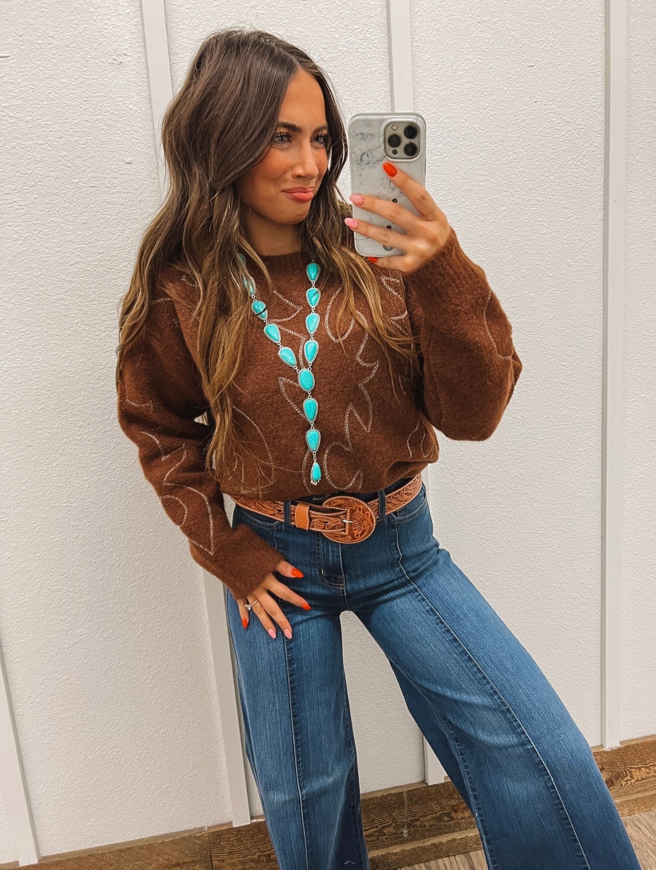Stay warm and stylish with our Bootstitch Cozy Sweater in Brown. Made with high-quality materials and featuring a classic western-inspired design, this sweater is perfect for any outdoor adventure or cozy night by the fireplace.