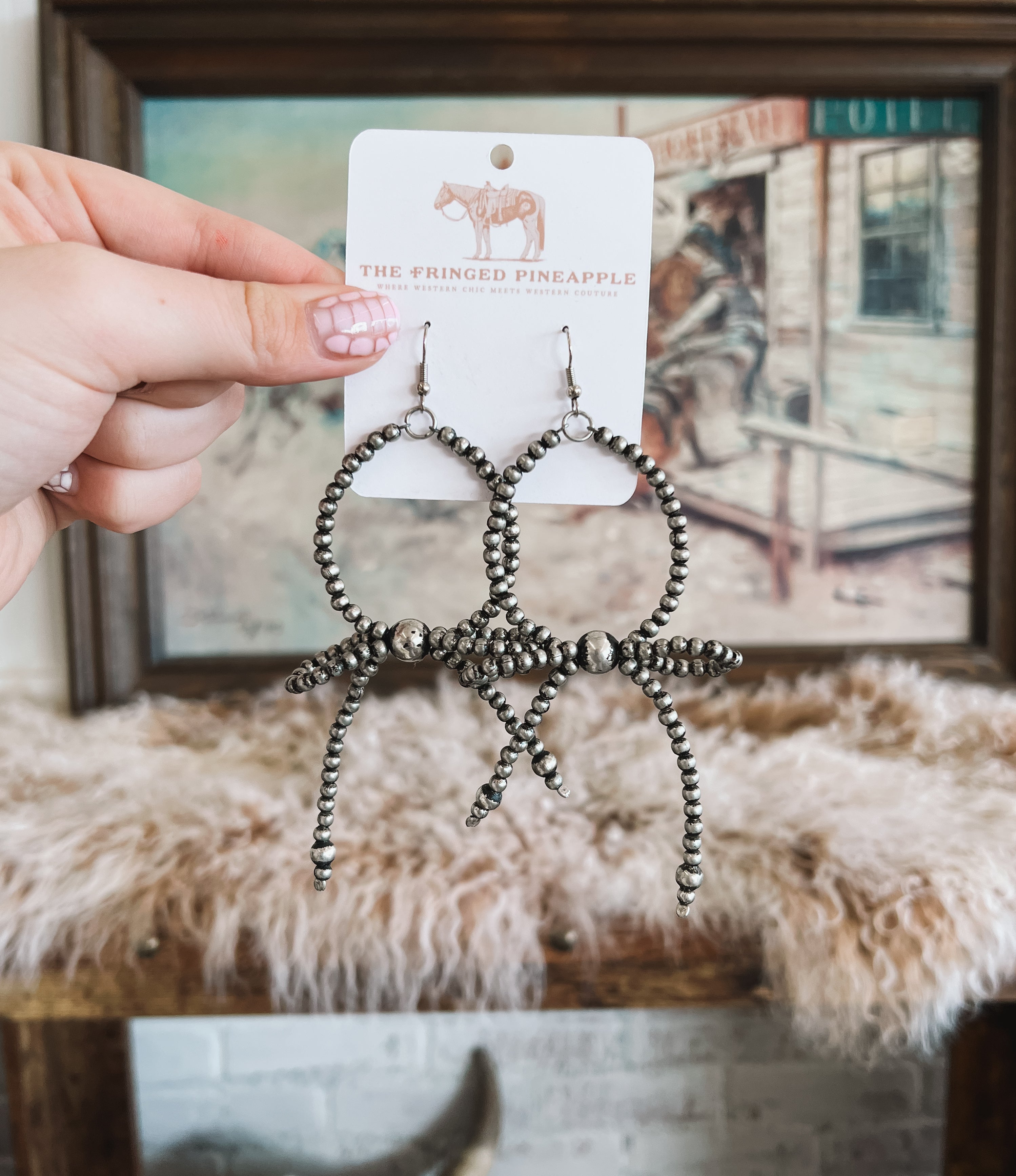 Make a bold statement with these Bow Babe Silver Polished Earrings. Crafted entirely from gleaming silver-tone beads, these oversized hoops feature an eye-catching bow design that commands attention. Delicate dangle strands flow from a substantial focal bead at the center, creating sculptural dimension and movement with every wear. The polished metallic finish catches the light beautifully, delivering that perfect blend of glamour and edge. Ideal for those who aren't afraid to let their accessories do the talking.