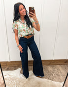 Wild, whimsical, and ready to ride—the Cactus Cowgirl Sheer Top is the perfect blend of desert charm and cowgirl sass. Featuring a playful print of cowgirls, cacti, and Western scenes, this lightweight button-up brings personality to any outfit while keeping things breezy and bold. Its sheer fabric adds a flirty touch, while the classic collar and short sleeves keep it grounded in timeless Western style.