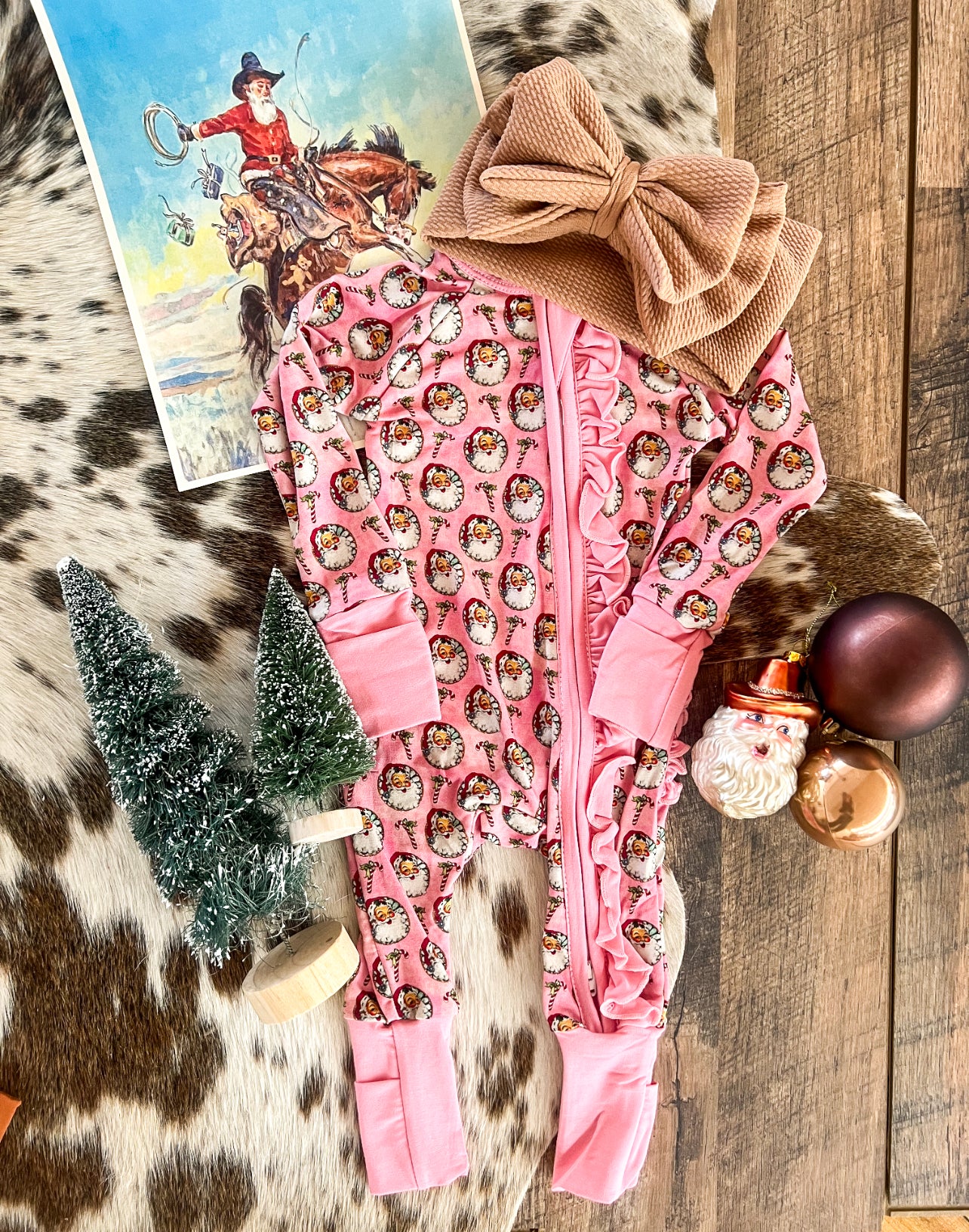 Look jolly in our Candy Canes And Santa Christmas Pajamas! Durable and comfortable for little cowboys and cowgirls alike, these festive pajamas make sure your kid will look adorable on Christmas morning.
