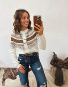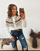 Cozy, classic, and western-inspired — the All The Ways Western Cardigan brings a warm, stylish touch to your cool-weather wardrobe. With its soft knit feel and beautifully patterned yoke, this button-front cardigan blends timeless charm with a subtle western edge. The cropped length makes it perfect for pairing with high-waisted denim, while the rich brown geometric detailing adds depth and character.