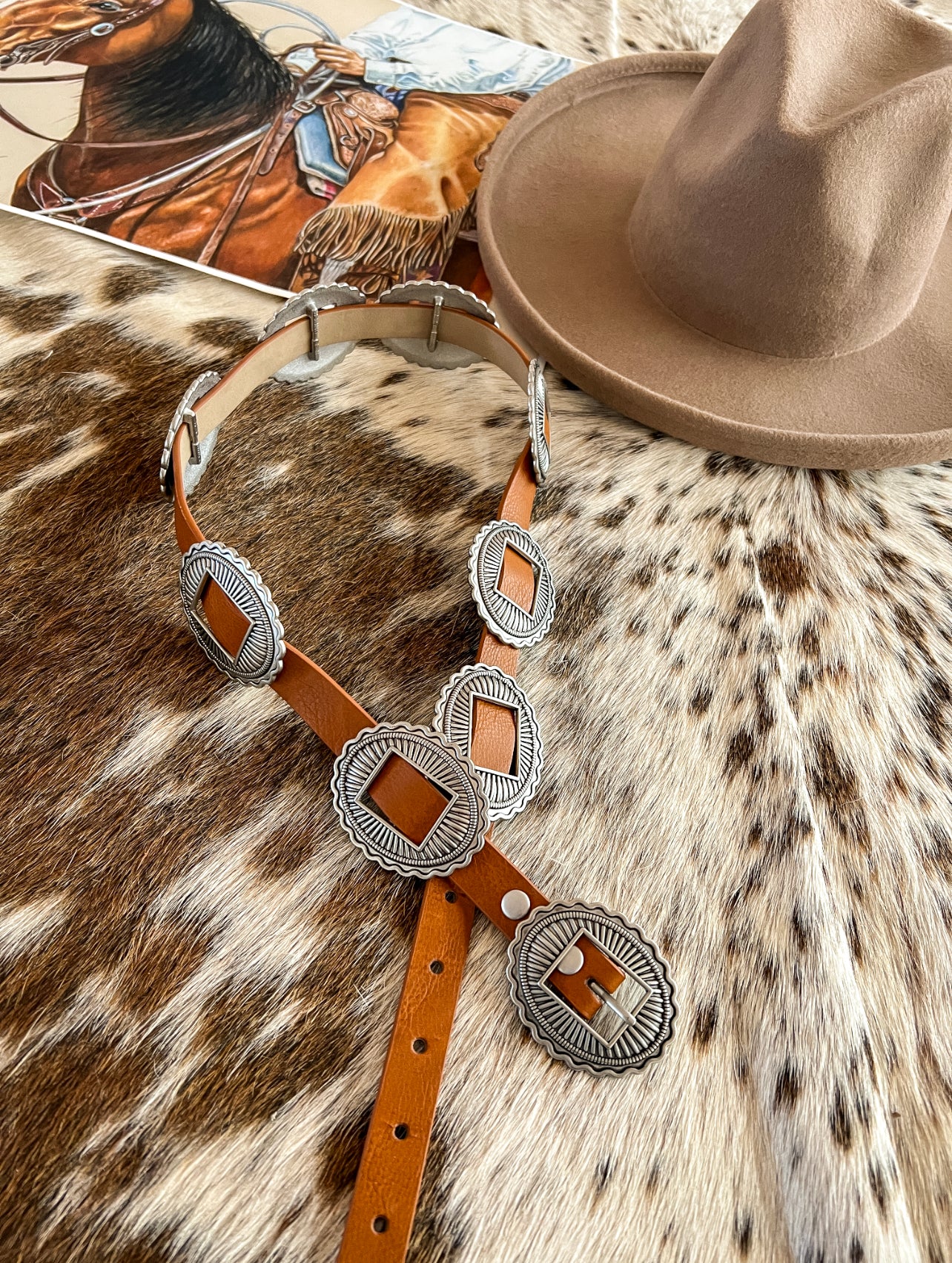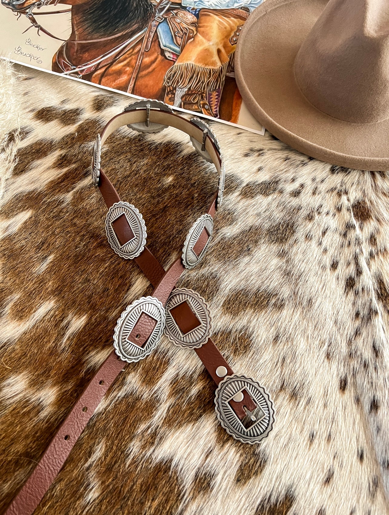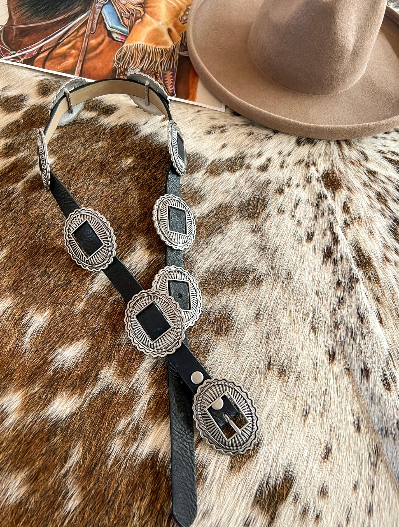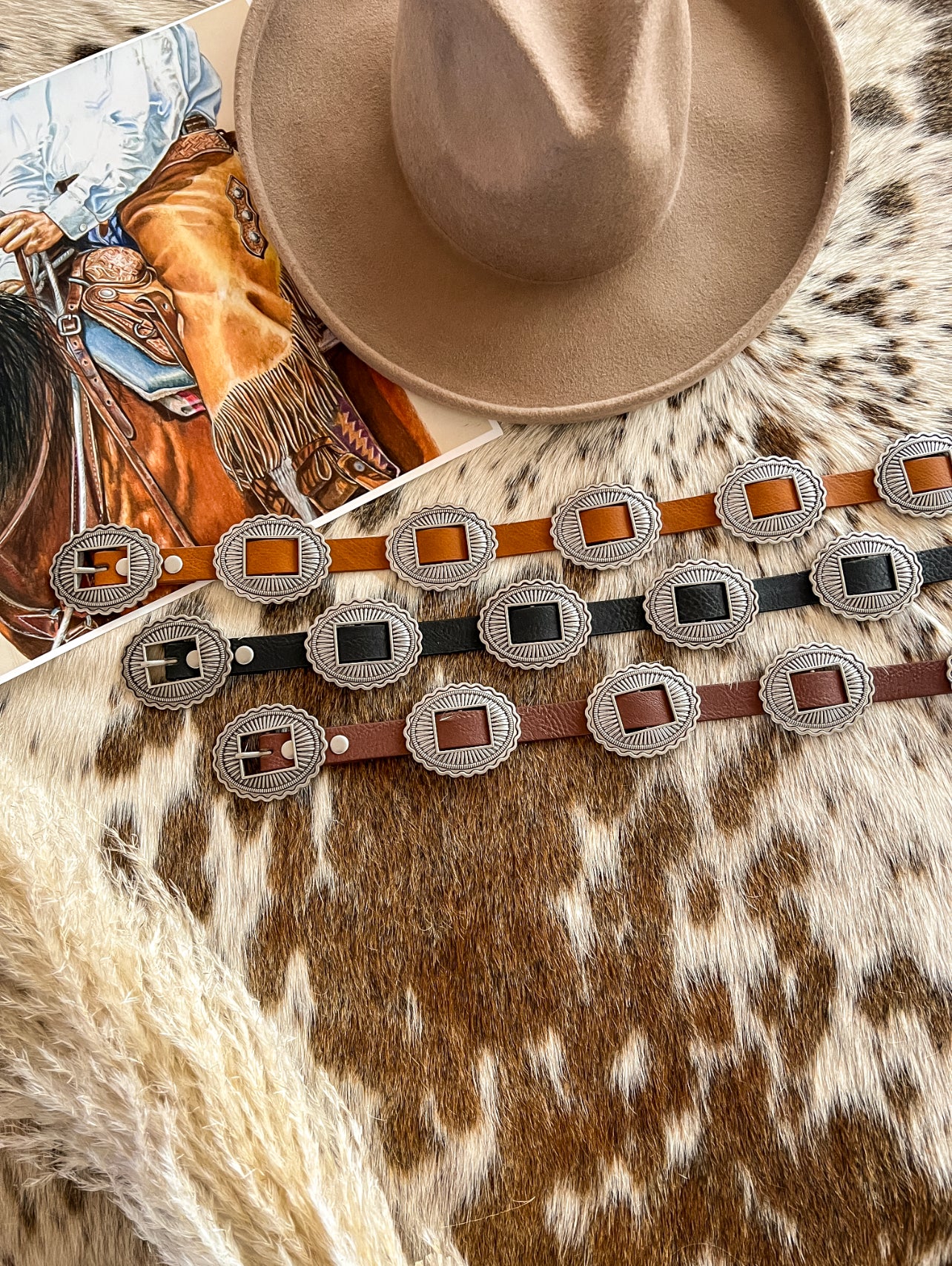 Each belt has 1 buckle and 8 matching conchos (Total 9 parts) Dimension of concho is 2.5" x 2" Width of strap is 0.75" or 20 mm Strap in pebble print made with quality leathrette.