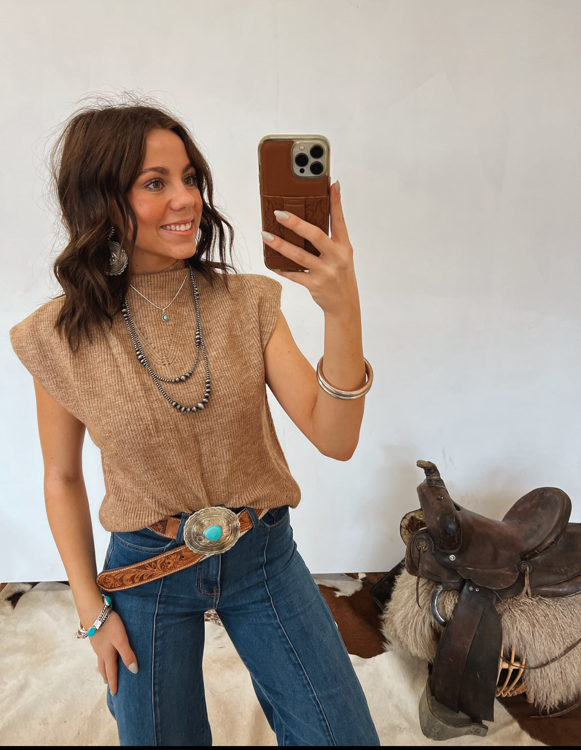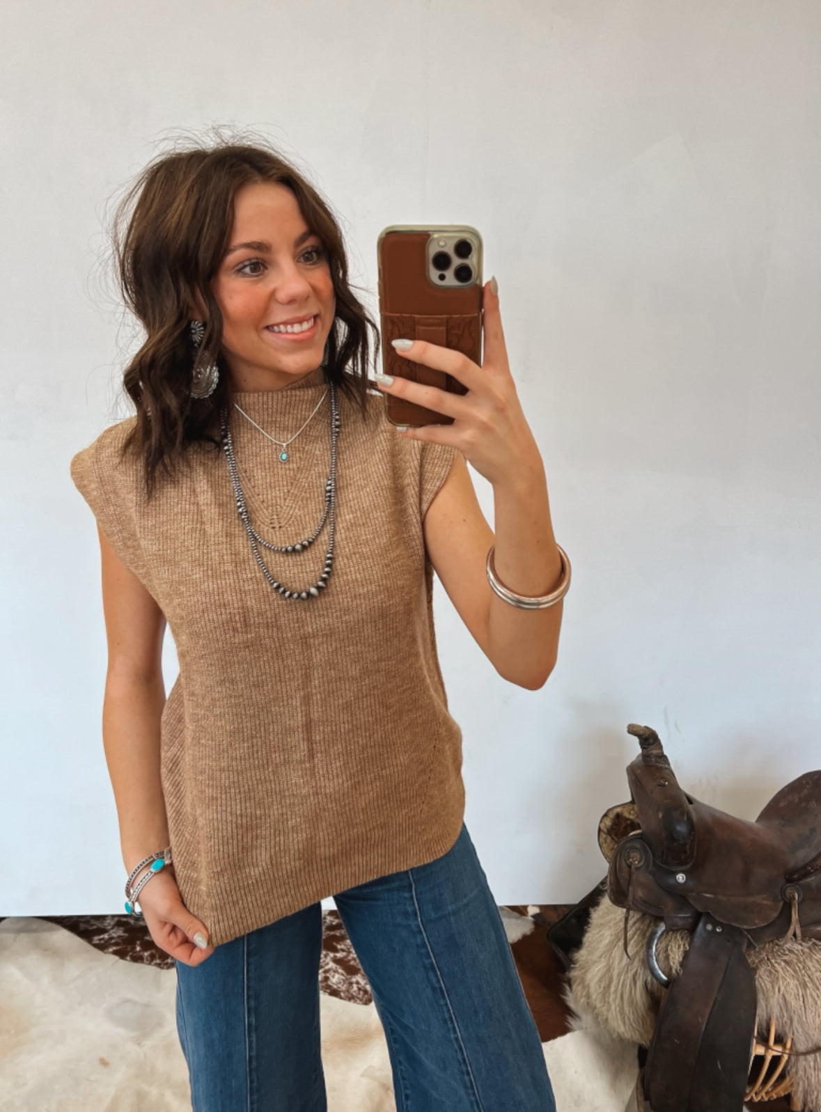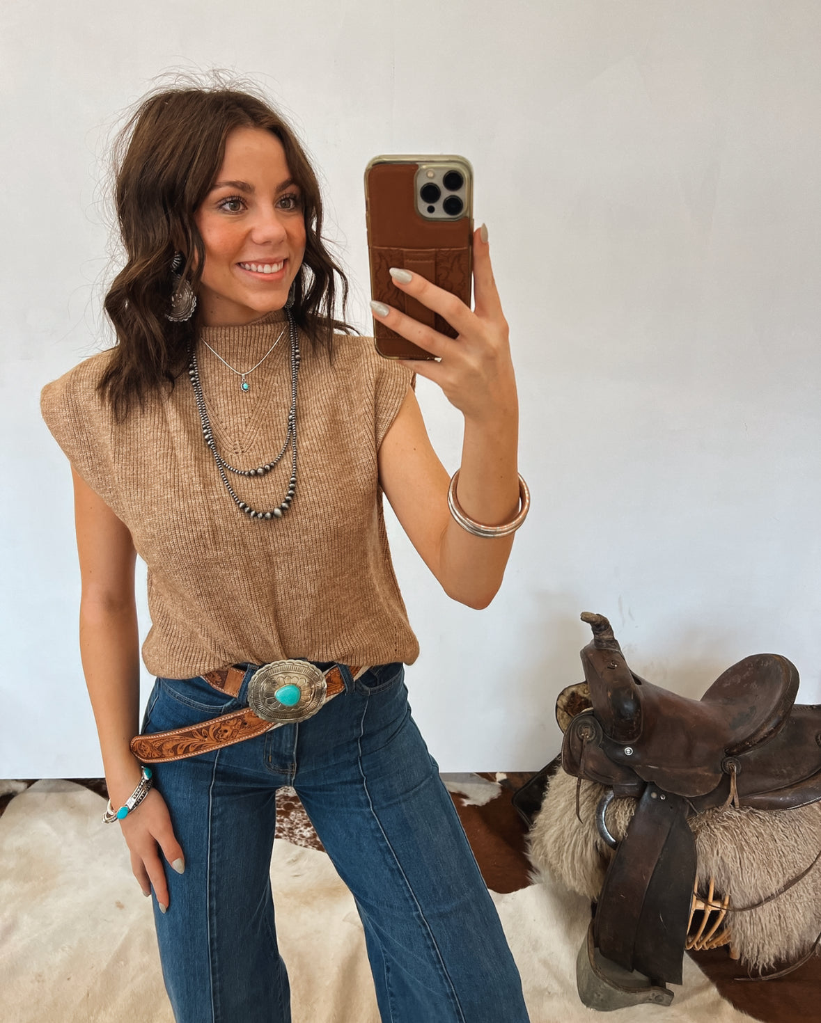 The Cozy Cowgirl Sweater Top is a western-inspired staple with a touch of modern charm. Designed with a sleeveless cut and a relaxed, slightly boxy fit, it’s perfect for layering under jackets or wearing solo when the sun is shining. The ribbed knit and mock neck add cozy structure, while the soft stretch blend keeps it comfortable for all-day wear.