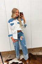 Meet your new go-to for western flair—the White Horse Denim Button Up Top blends classic cowboy cool with everyday comfort. Crafted from 100% cotton, this structured-yet-breathable button-up features crisp ivory woven fabric with bold denim accents on the collar, yoke, pockets, and cuffs.