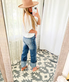 ULTRA HIGH RISE EXPOSED BUTTON 90'S FLARE STRETCHINESS LEVEL EXPOSED BUTTON FLY REGULAR HEM DISTRESSED |