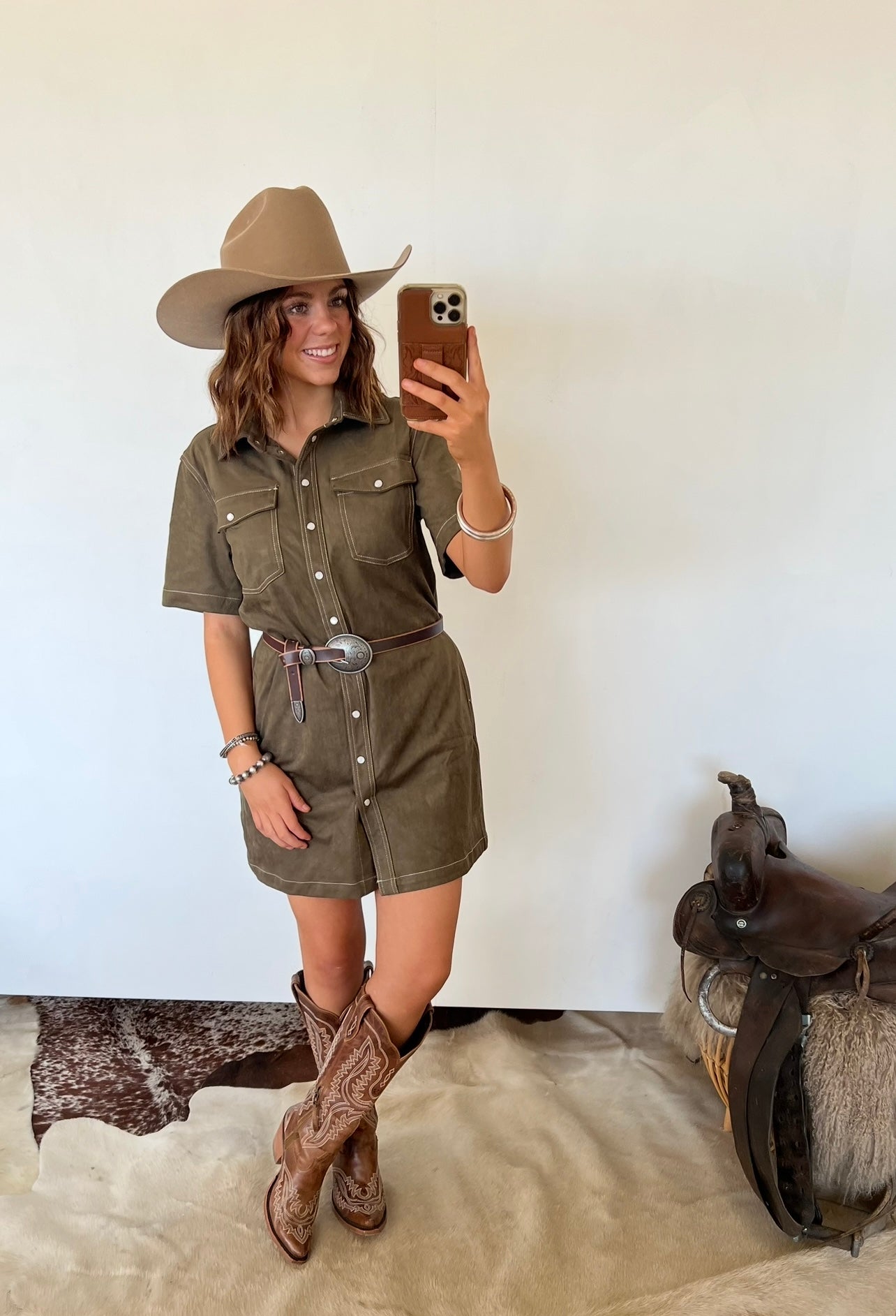 Made from a soft, stretchy suede-like fabric, this shirt dress features snap-button detailing down the front, chest pockets, and contrast stitching for that classic cowgirl-inspired look. The structured yet comfortable fit makes it flattering, while the suede finish adds a luxe touch that sets it apart from your everyday dress. Style it with tall boots and a hat for the ultimate western outfit, or dress it up with layered jewelry for a night out.