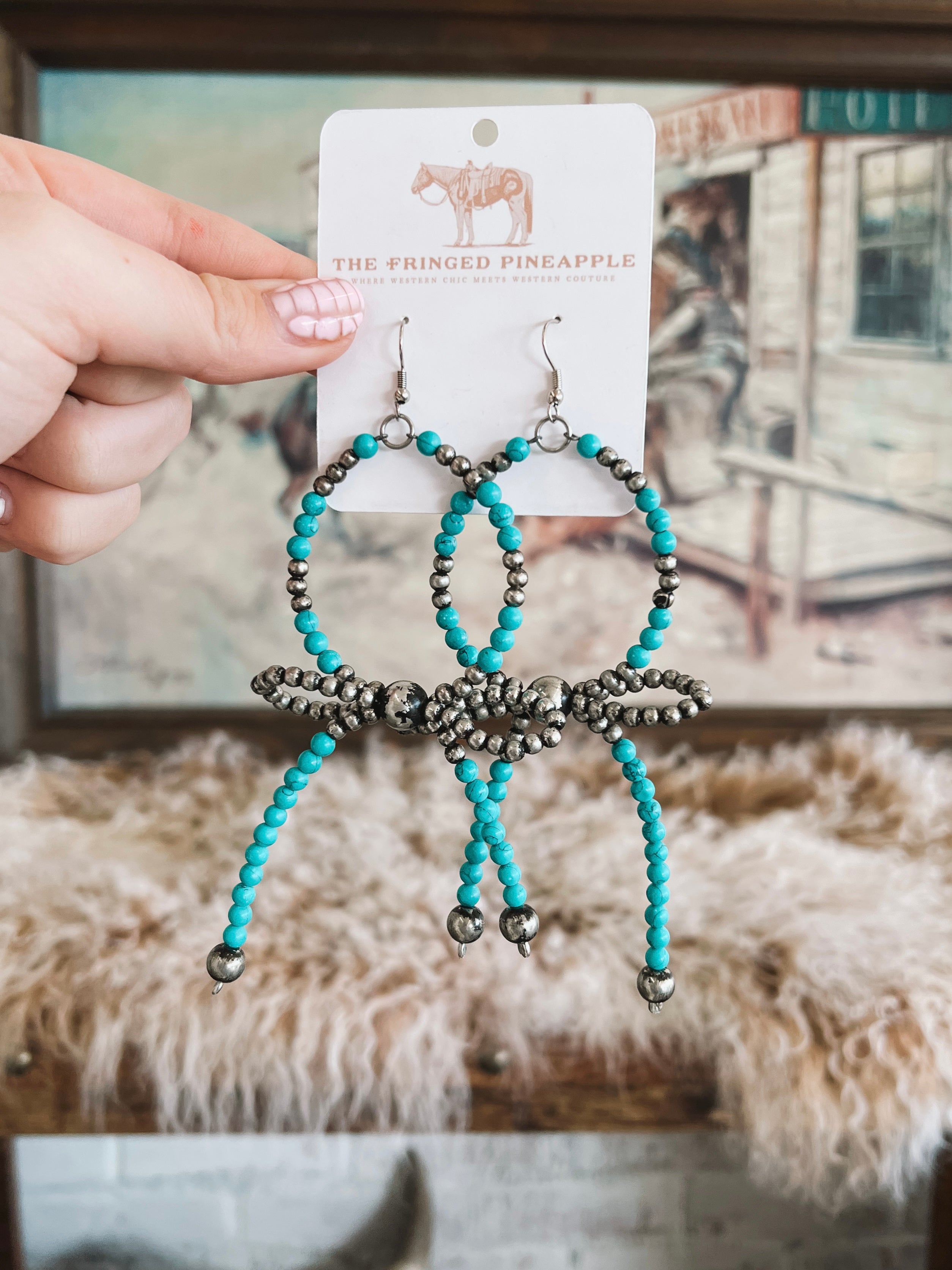 Make a bold statement with these eye-catching hoop earrings that blend southwestern charm with modern flair. Crafted from vibrant turquoise-colored beads and gleaming silver-tone metal spacers, each earring features a substantial circular frame adorned with a decorative bow centerpiece. The bow showcases silver-tone beads crowned with a polished round accent, while delicate turquoise bead strands dangle below, finished with metallic silver accents for graceful movement. Perfect for adding personality and dimension to any outfit.