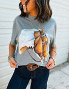 Grace, grit, and a whole lot of heart. The Bridled Beauty Tee features a hand-painted-style graphic of a stunning chestnut horse in full tack, captured in soft strokes and earthy tones. Set on a faded stone blue backdrop, this classic western tee brings elegance to your everyday cowgirl style.