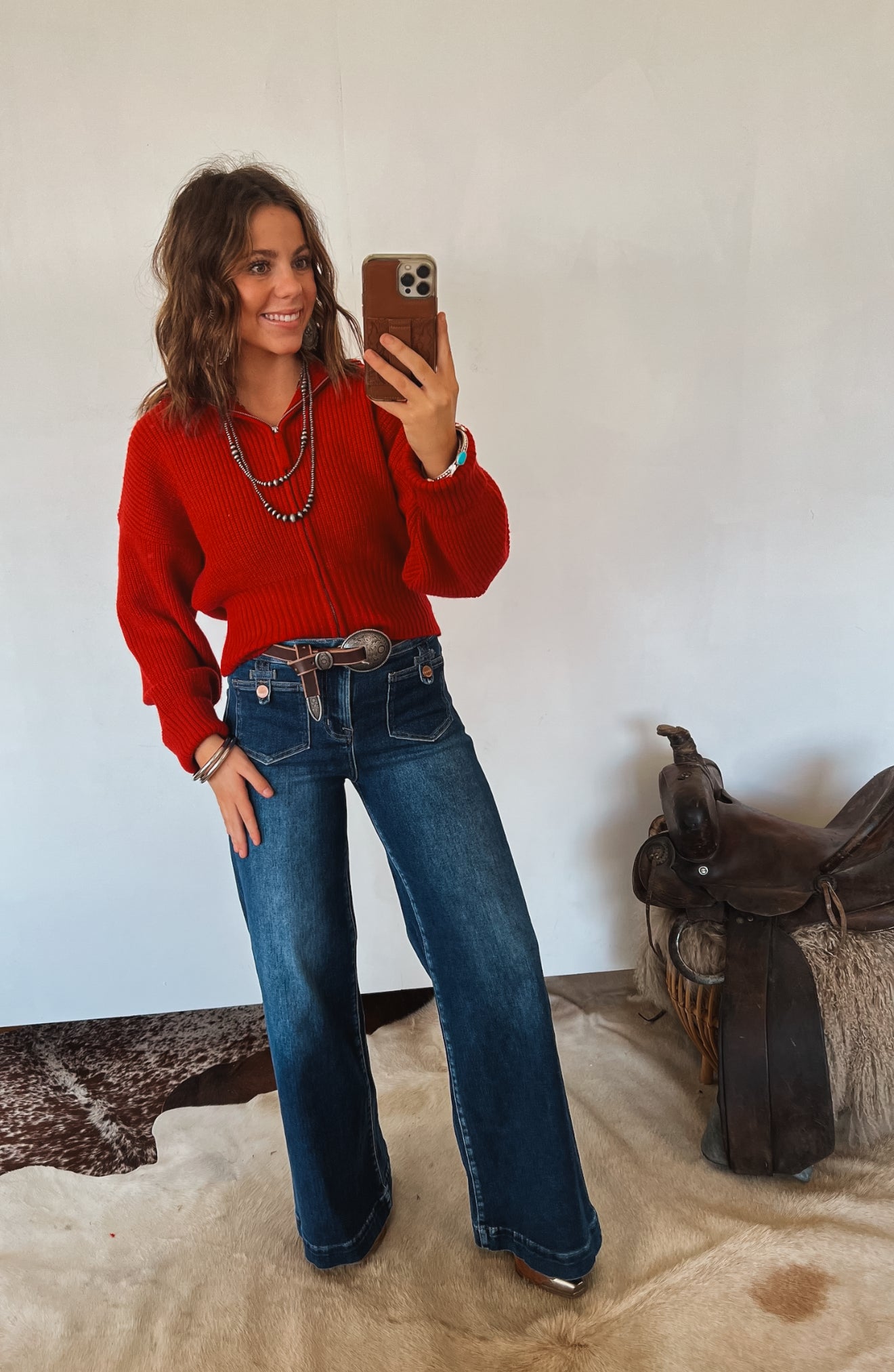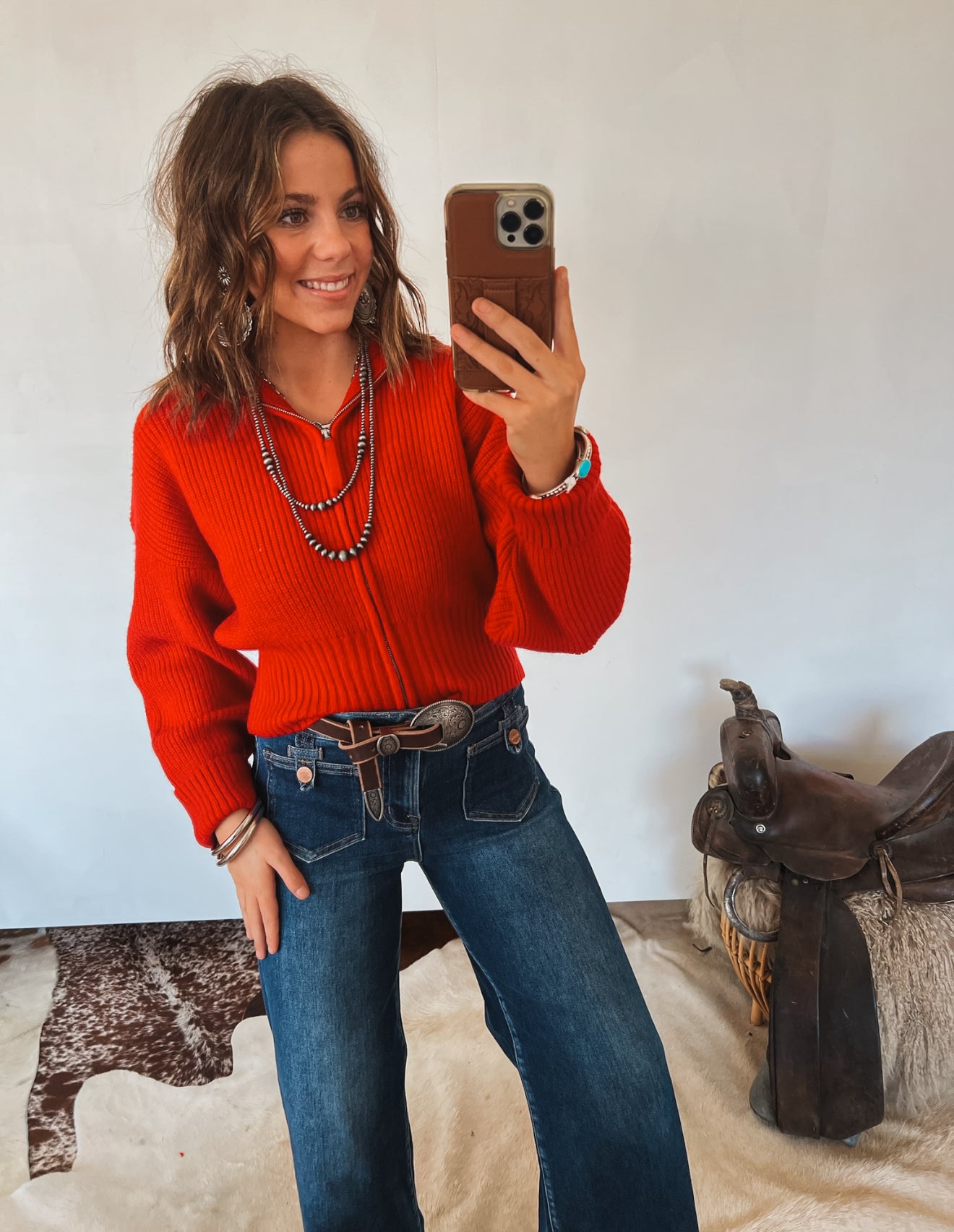The Collared Zip-Up Sweater is where cozy meets cool with a touch of modern western edge. Featuring a ribbed knit texture, chic collar, and functional two-way zipper, it’s the perfect blend of comfort and versatility. Dress it up or down, this sweater is a closet essential you’ll keep reaching for.