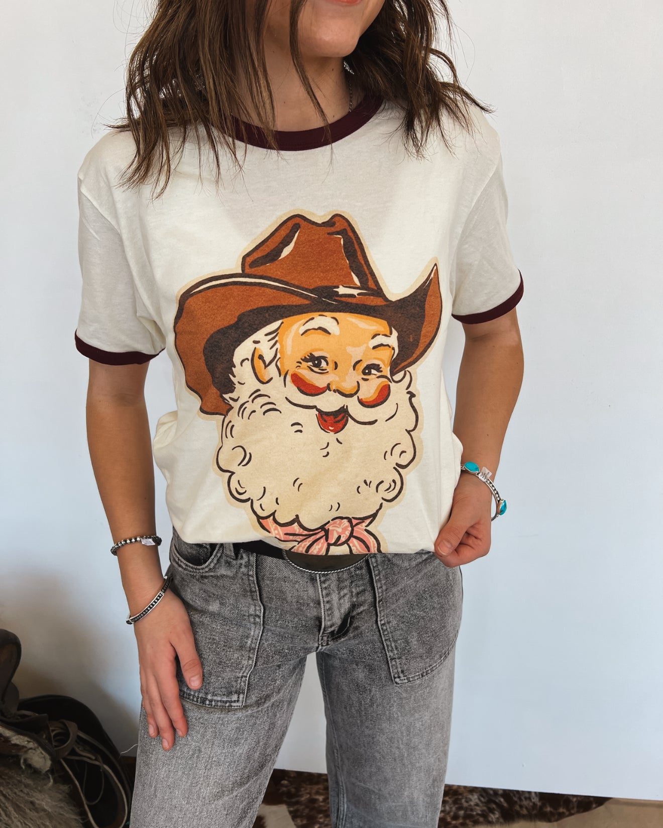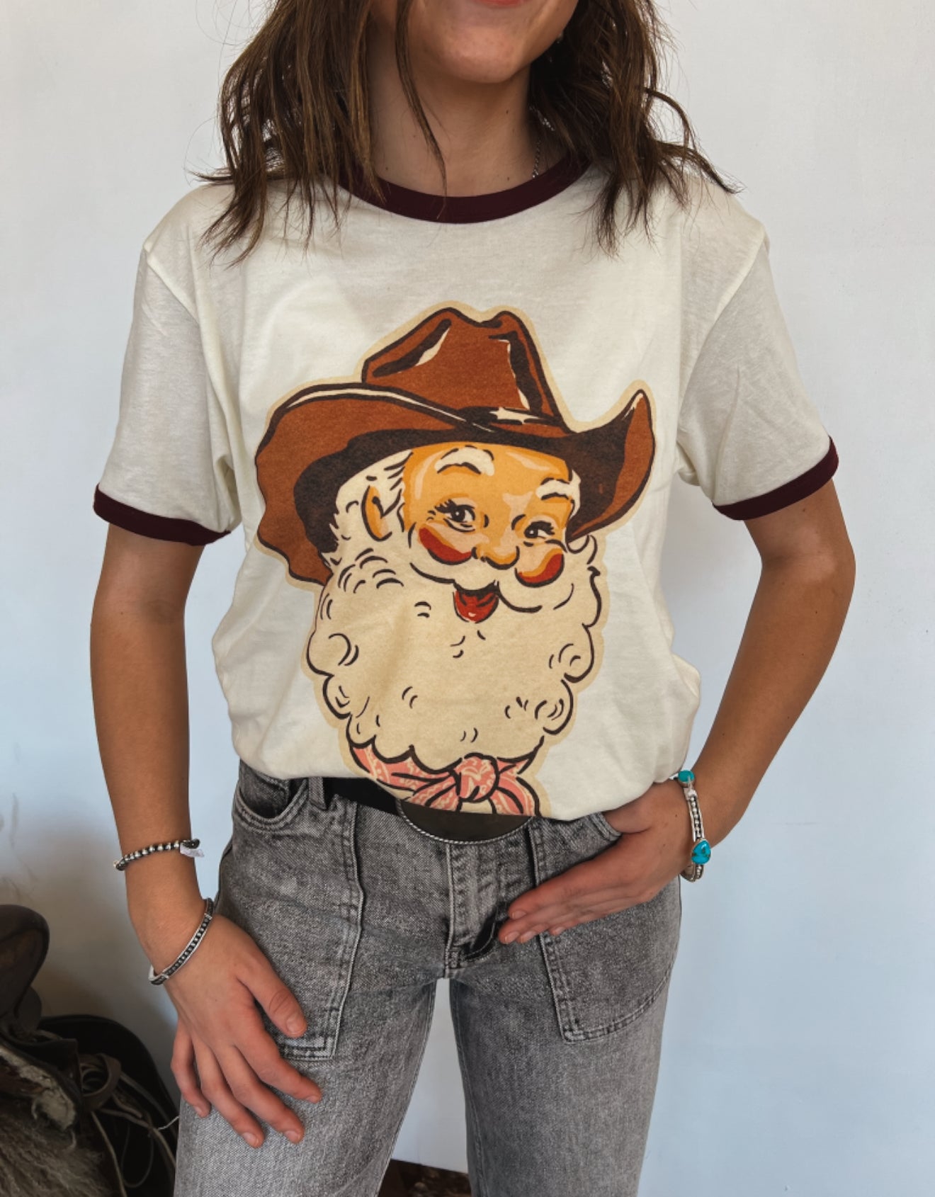 Give your holiday wardrobe a Western twist with our Cowboy Santa Ringer Tee! Featuring a bold vintage-style cowboy Santa graphic printed on a soft cream ringer tee with burgundy trim, this festive top is perfect for pairing with denim, rings, and turquoise for the cutest ranch-side Christmas look.