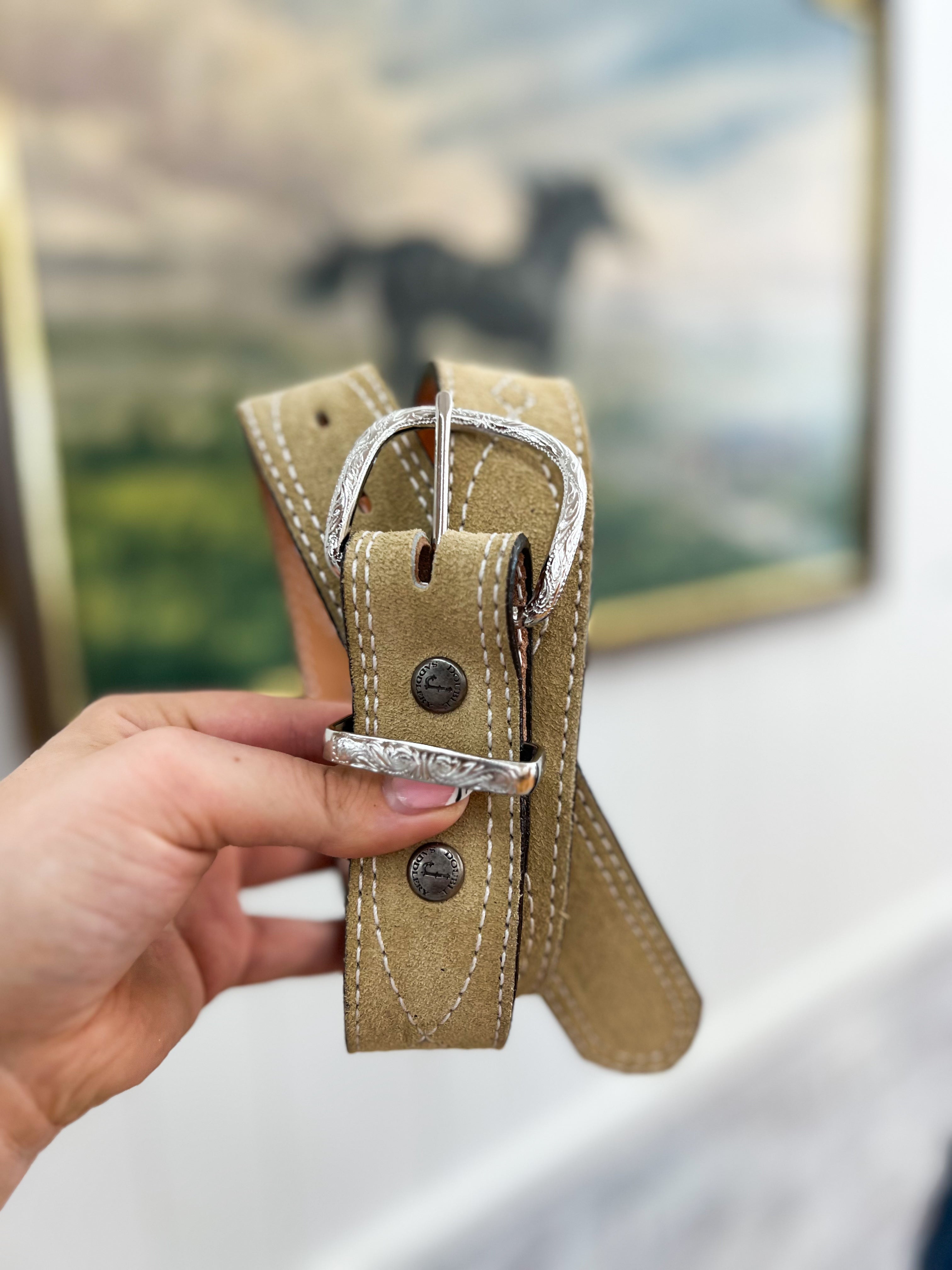 Crafted for durability, comfort, and classic Western style, this premium suede belt is designed to be your everyday favorite. The exterior features buttery-soft suede leather, while the interior is lined with Herman Oak saddle skirting leather—one of the highest-quality leathers used in traditional saddle making. The result is a belt that’s both rugged and refined, built to keep its shape and stand up to years of wear.