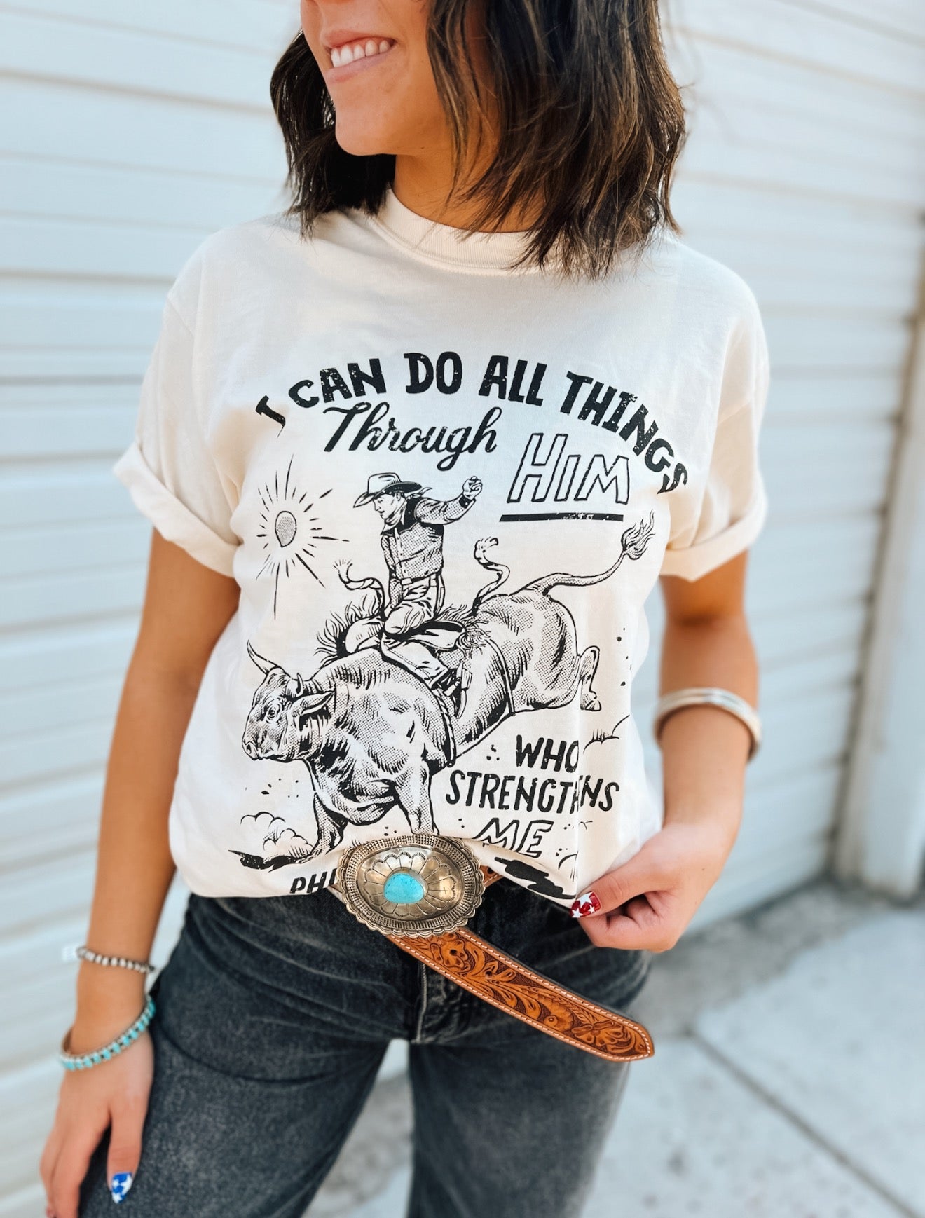 Ride bold, believe louder. The Through Him tee is a faith-filled statement piece that blends cowboy grit with gospel truth. Featuring a buckin' bull rider and the verse from Philippians 4:13 — "I can do all things through Him who strengthens me" — this tee is made for those who draw their strength from above and their style from the saddle.