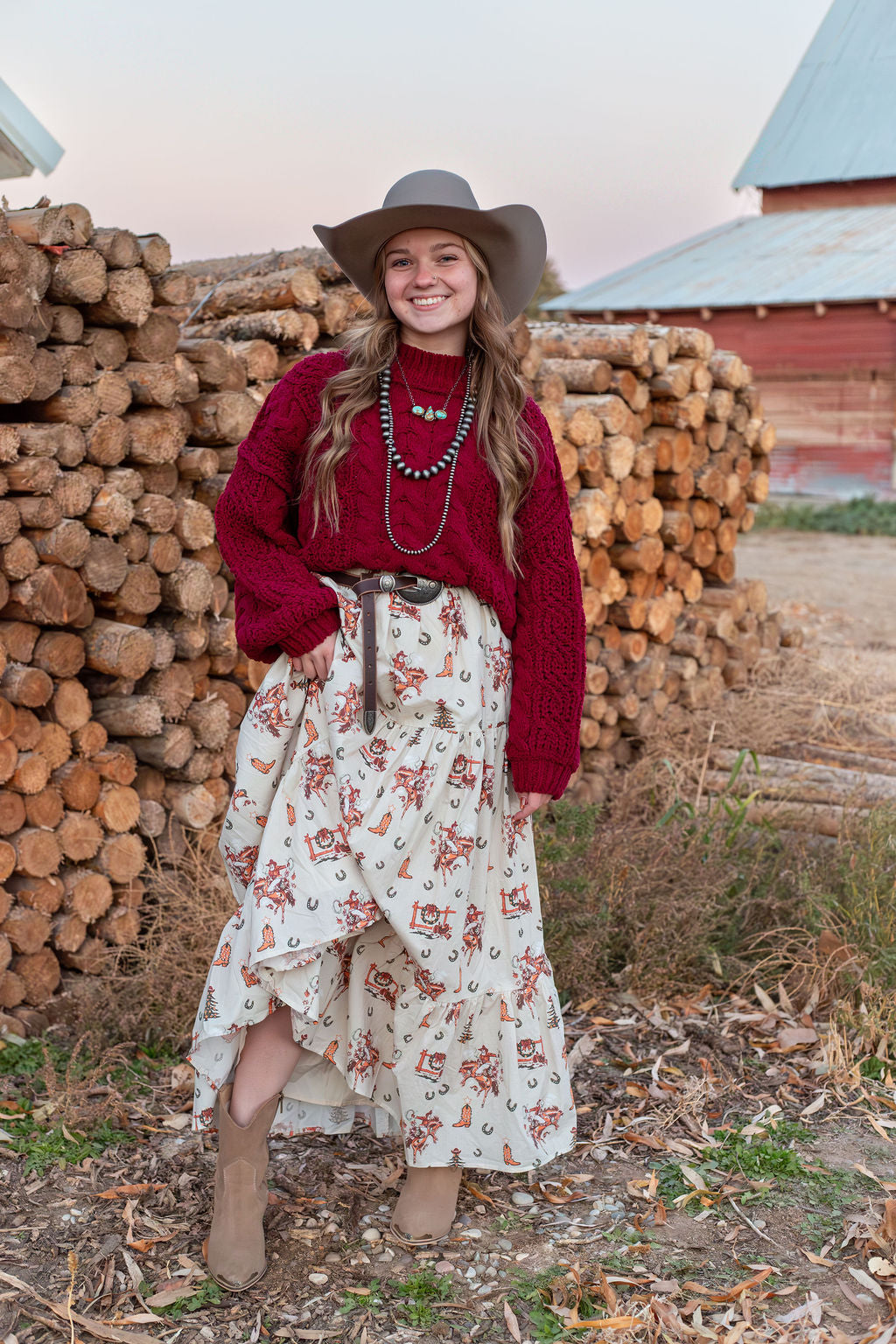 The flowy, tiered silhouette gives it that prairie-girl twirl, while the elastic waistband keeps things comfy and flattering. Pair it with boots and a tucked tank or dress it up with a western blouse and statement belt. However you style it, this skirt is made for trailblazers and rodeo queens alike.