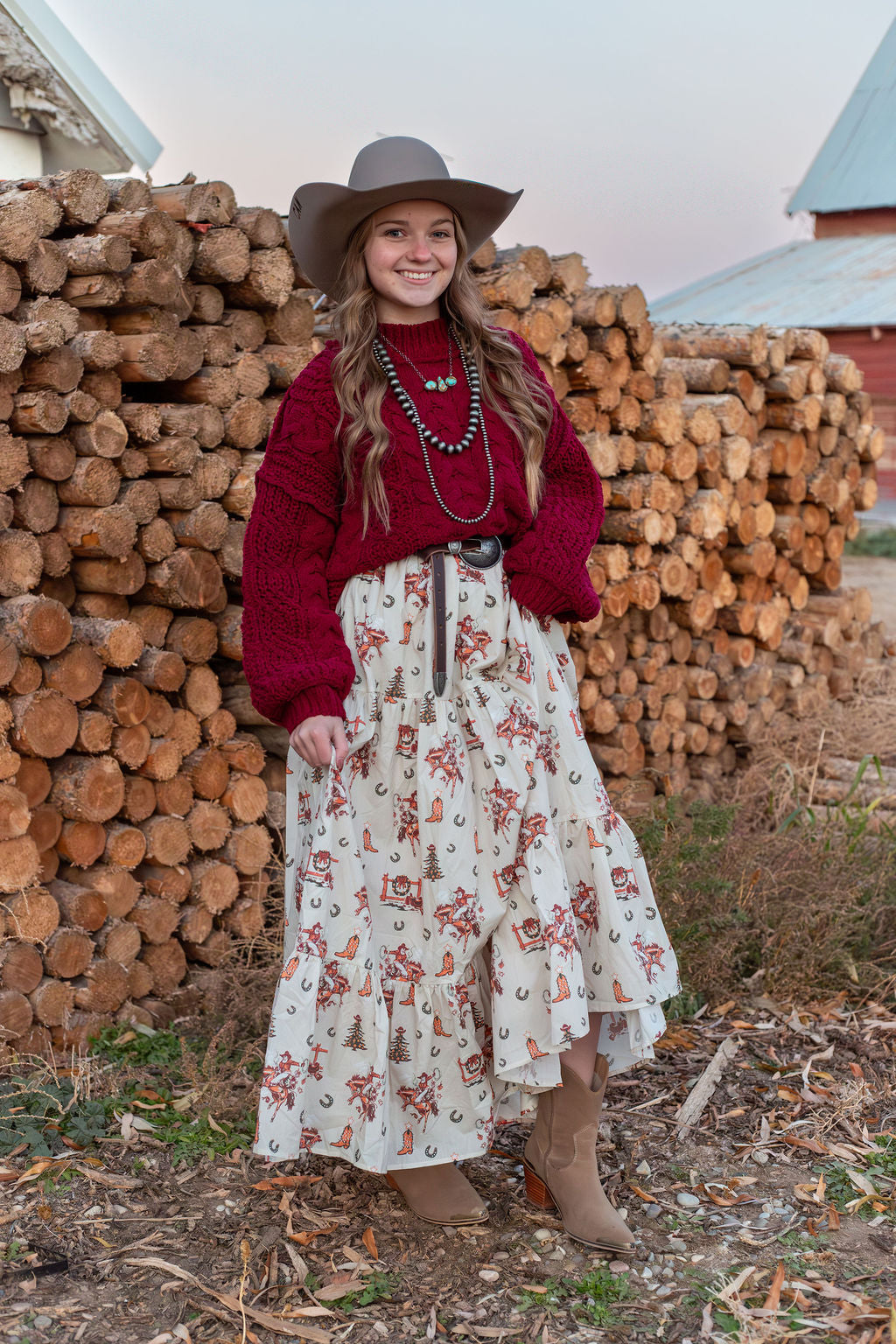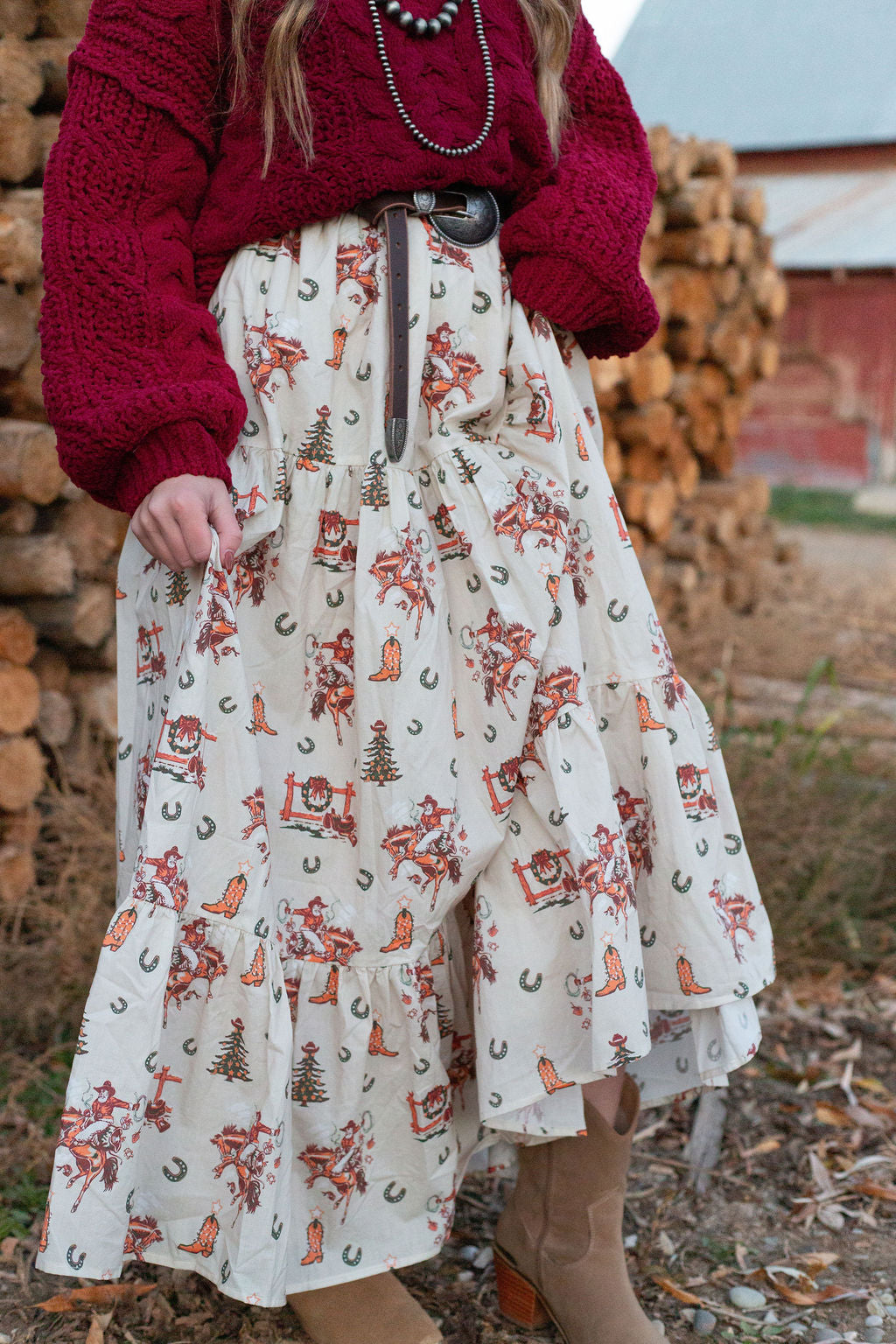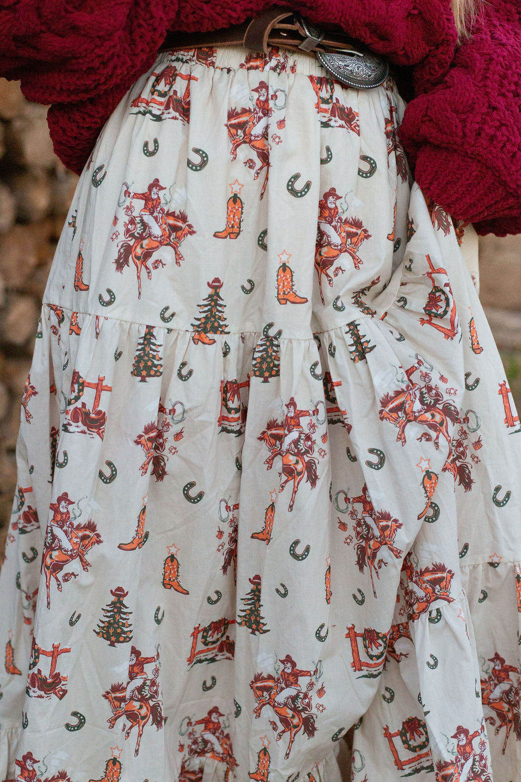Saddle up, darlin’—the Ole'Santa Skirt is here to wrangle hearts and turn heads. With a vintage cowboy print full of bronc bustin’ and lasso action, this skirt brings the spirit of the Wild West into your wardrobe.