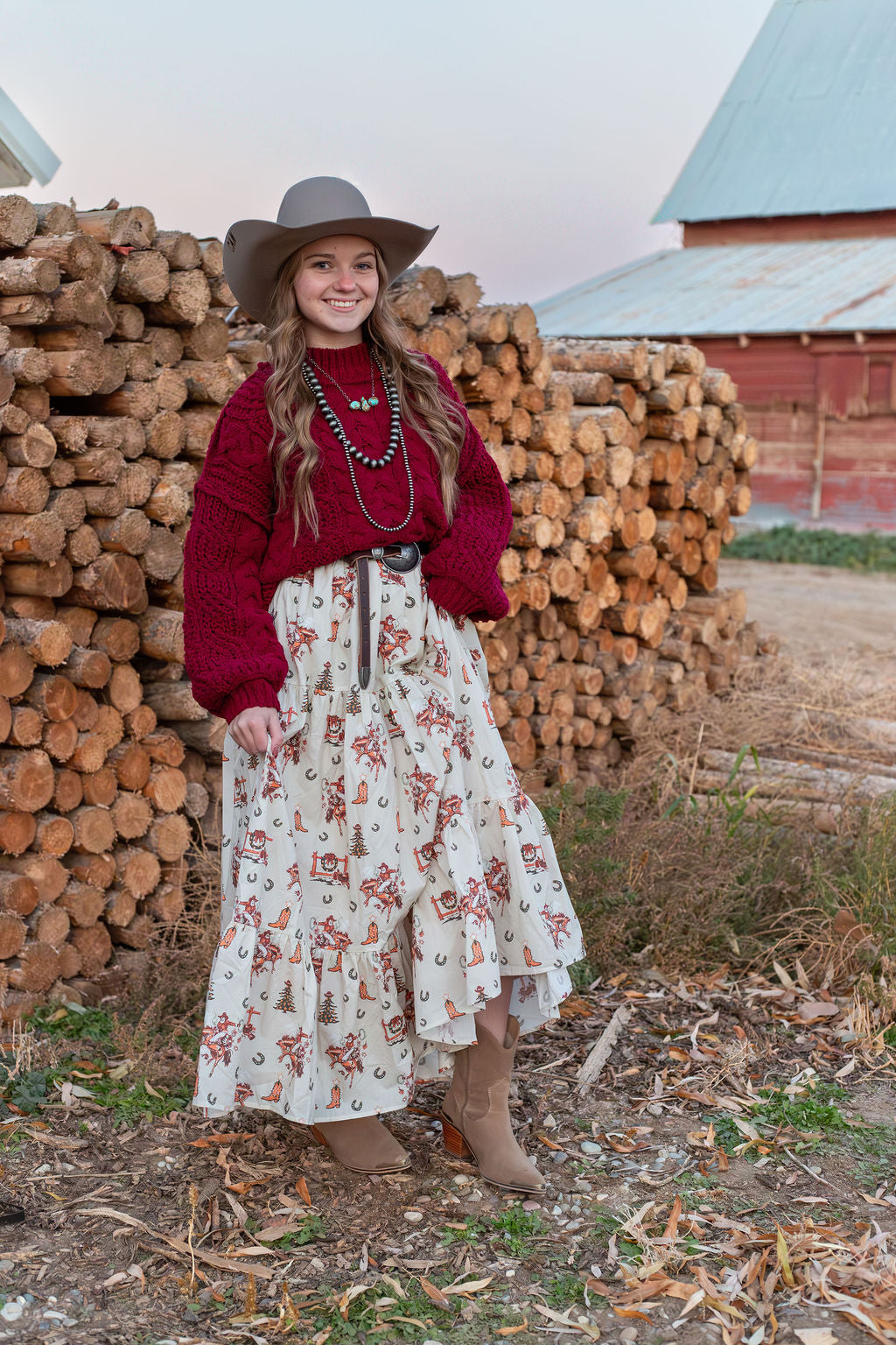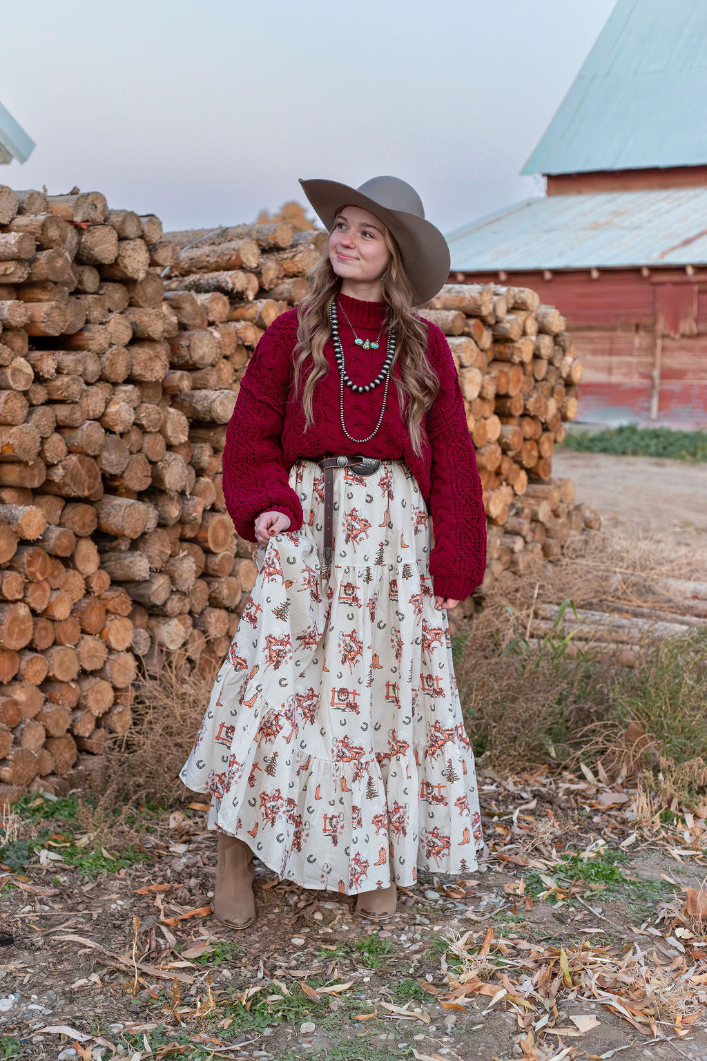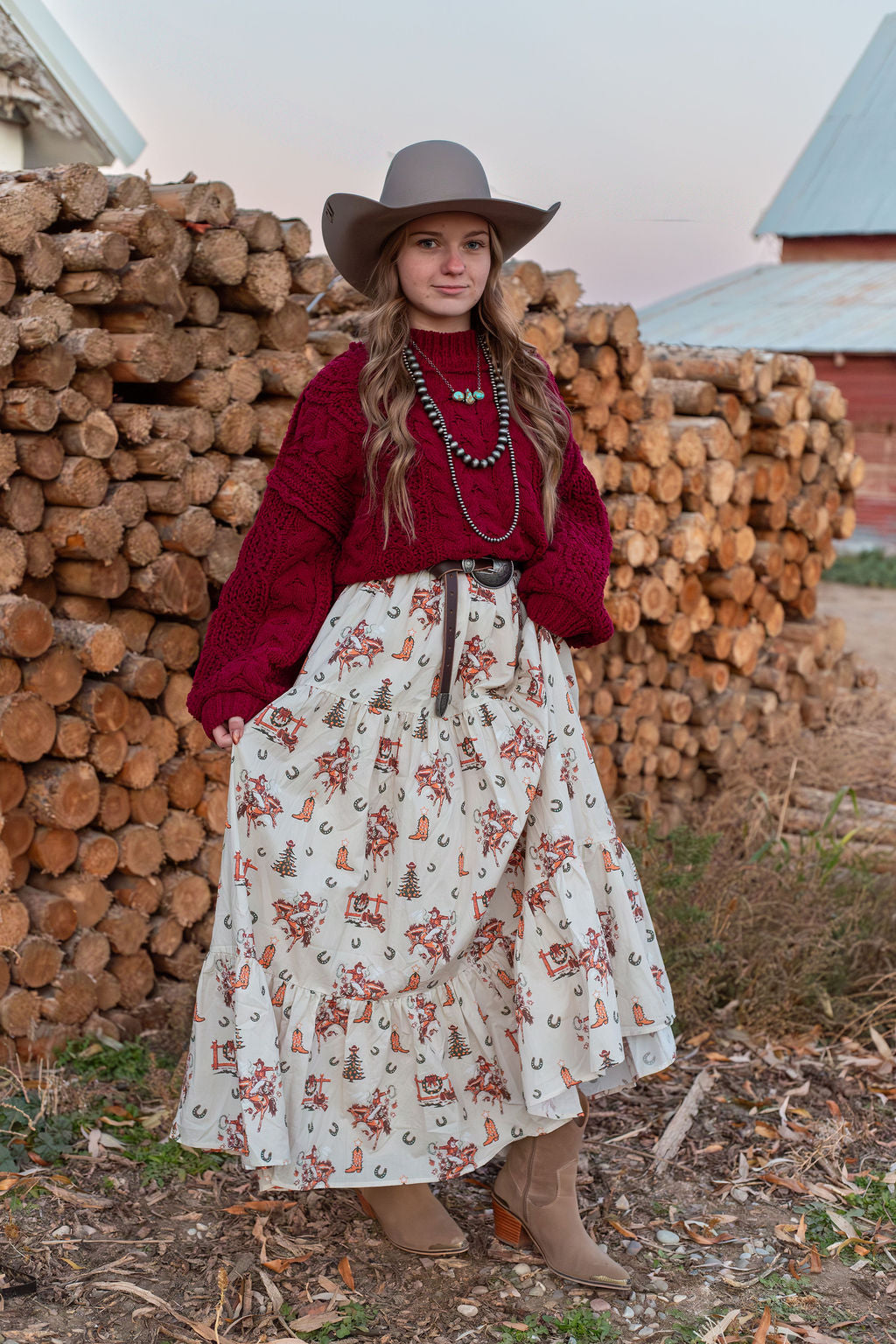 Saddle up, darlin’—the Ole'Santa Skirt is here to wrangle hearts and turn heads. With a vintage cowboy print full of bronc bustin’ and lasso action, this skirt brings the spirit of the Wild West into your wardrobe.