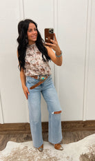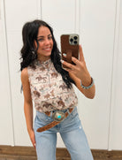 This isn’t your average tank. The Ole' West Cowboys Ruffle Neck Tank brings classic cowgirl grit to a breezy, feminine silhouette. Featuring a playful allover rodeo print with bronc riders, lassos, and western charm, this top captures the spirit of the wild west—no boots required.