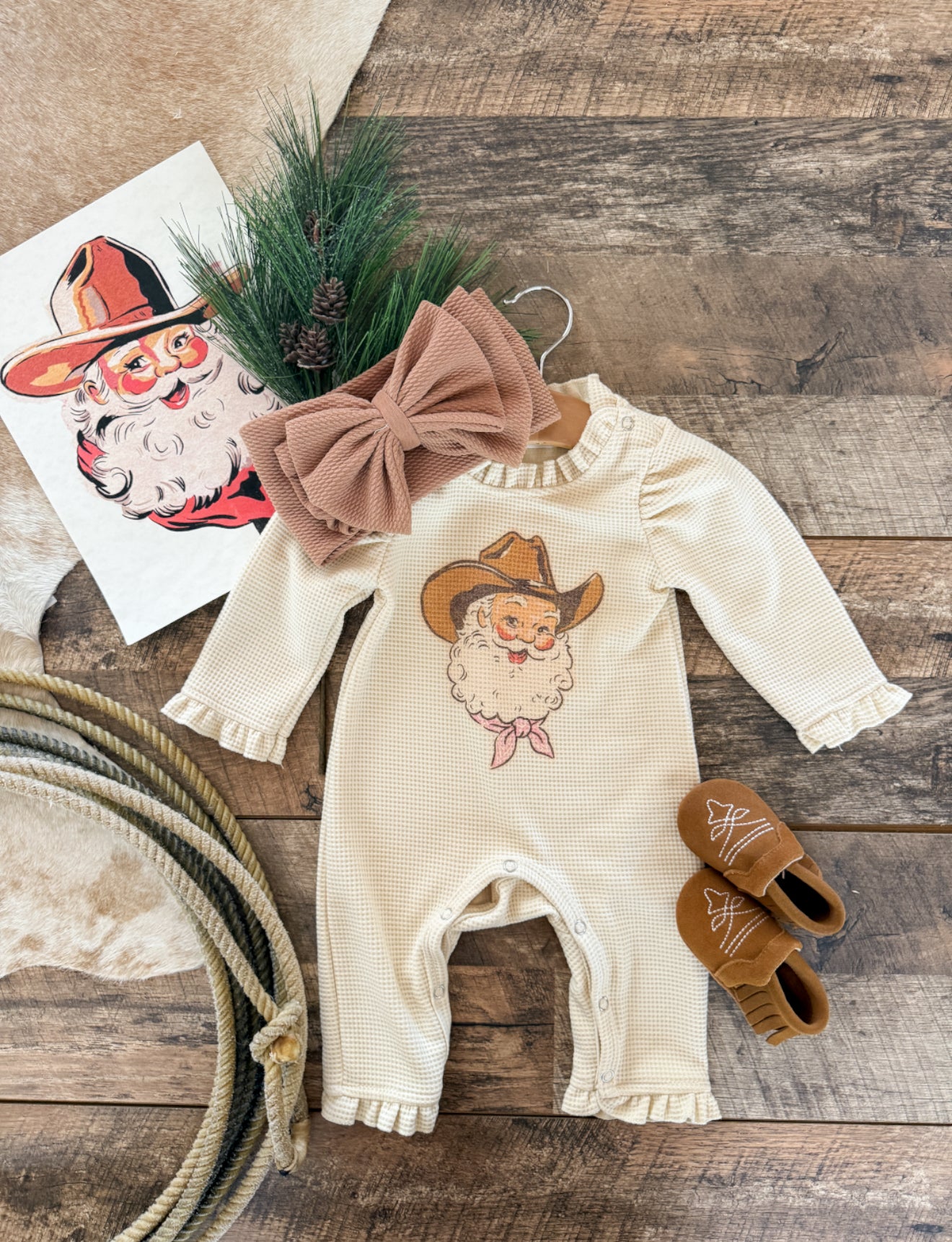 Cowboy Santa Christmas Waffle Romper (Cream)