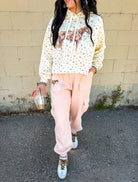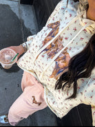 Saddle up in comfort and cowgirl charm with the Good Horse Floral Hoodie—a dreamy blend of Western vibes and cozy-day style. Featuring a cropped hoodie with delicate allover florals and a beautifully sketched saddle horse front and center, this set brings soft prairie energy to your everyday look.. Whether you're grabbing coffee, running errands, or kicking back after a long day, this hoodie is made for gals who ride hard and lounge harder.