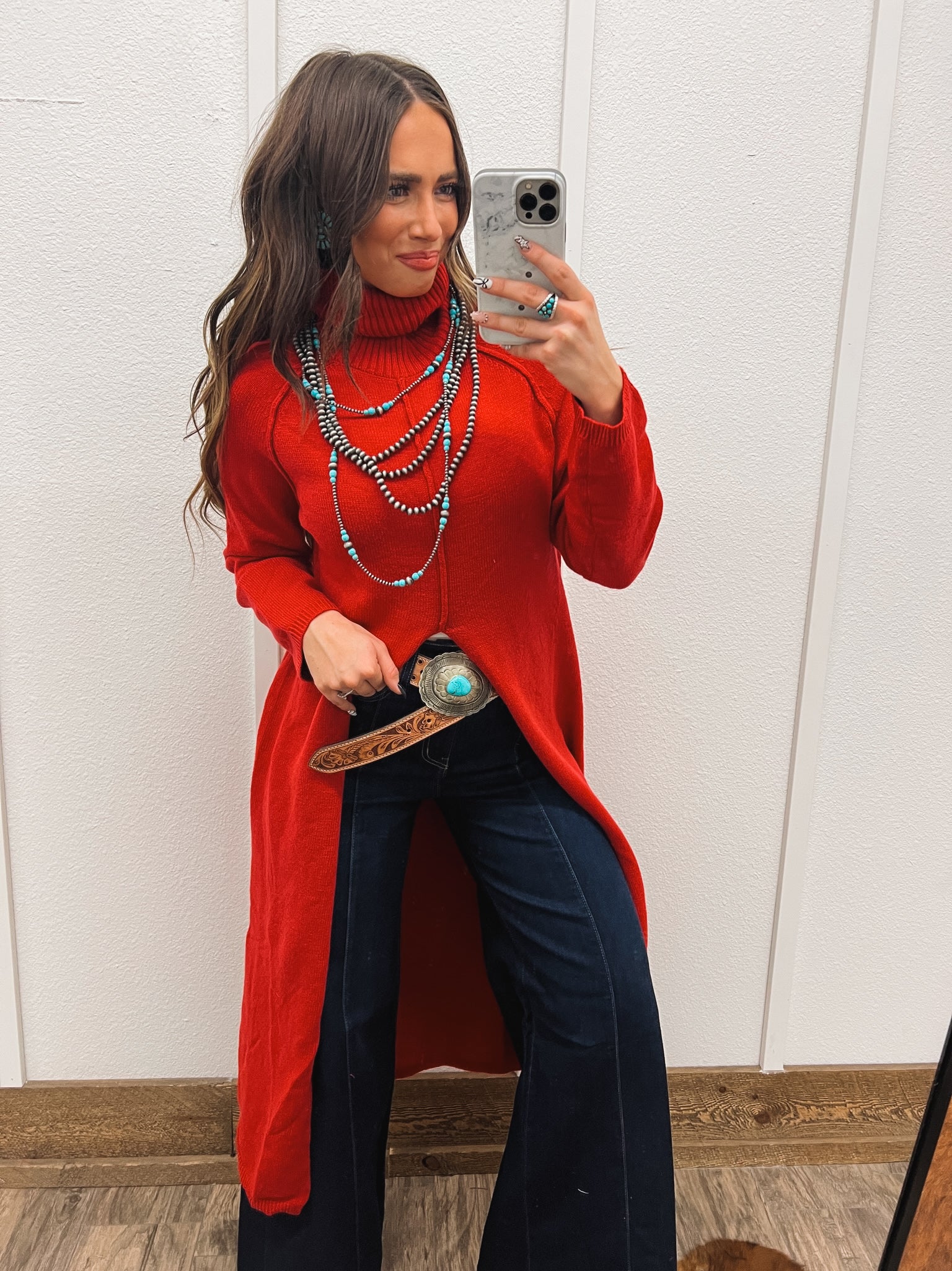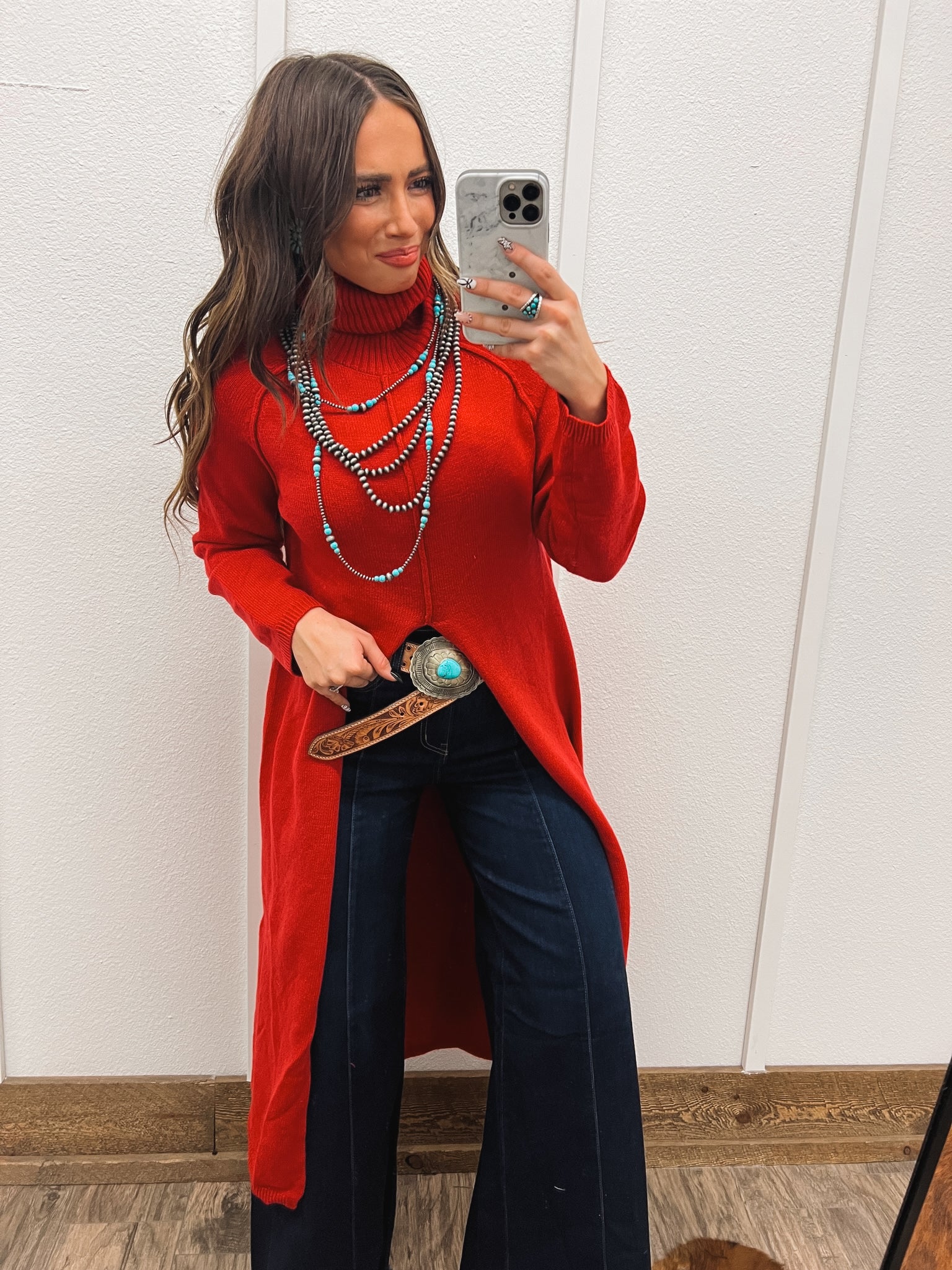 (Restocking Nov 25')Turtle Neck Sweater Dress With Slit (Red)