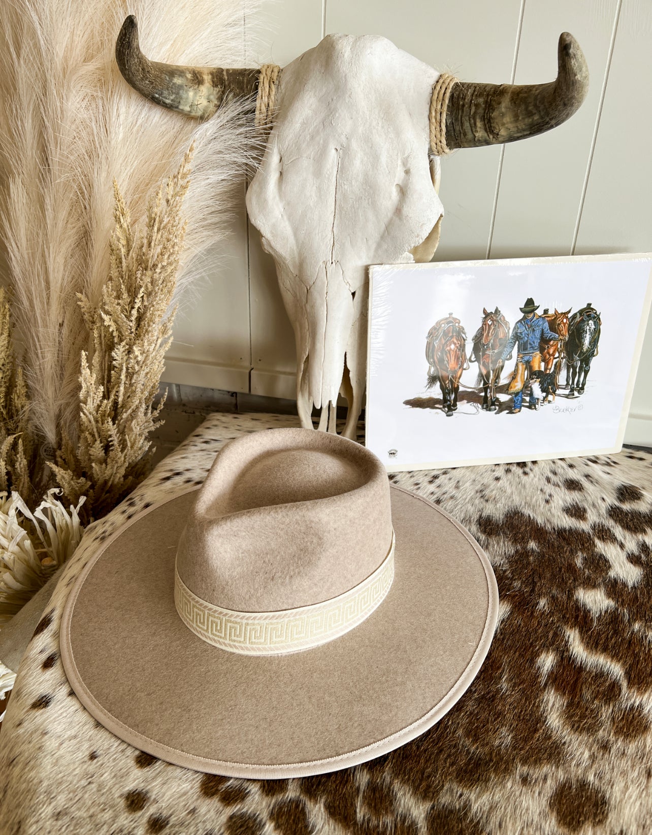 The Wild Miss Hat in oatmeal pairs classic style with comfort. Rich wool material ensures lasting quality and the traditional wide brim provides a western look.